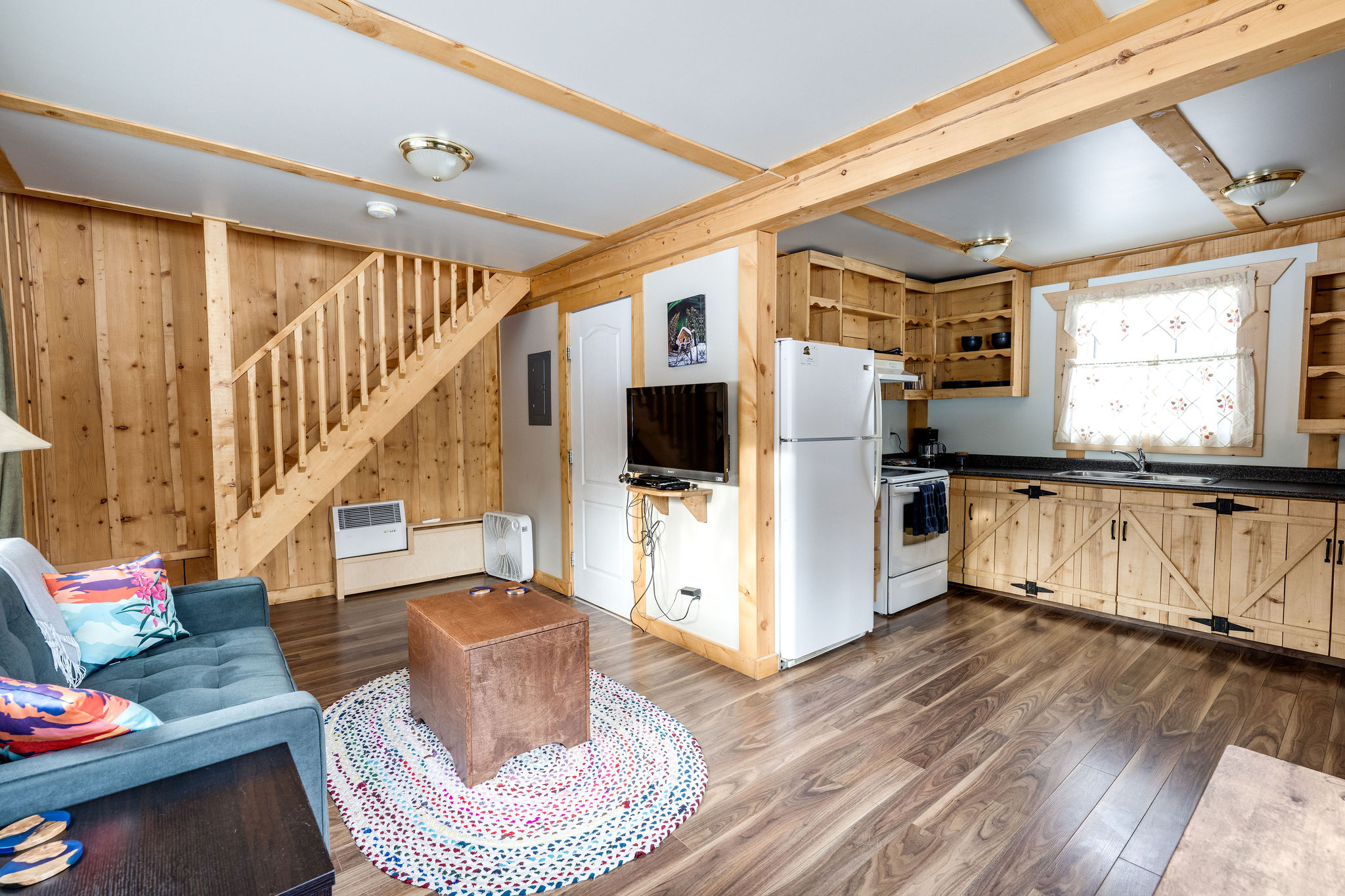 Cabins 2 & 3 are each 400 square foot 1 1/2 story structures with a bedroom upstairs. They each have have 2 double beds (in the same bedroom) and are completely furnished with a full kitchen, full bathroom, living room/dining room furniture, bed and bedding, washer and dryer. There is Internet, satellite TV, wood and electric heat, and a bar-b-que and vegetable garden for use in the summer months.